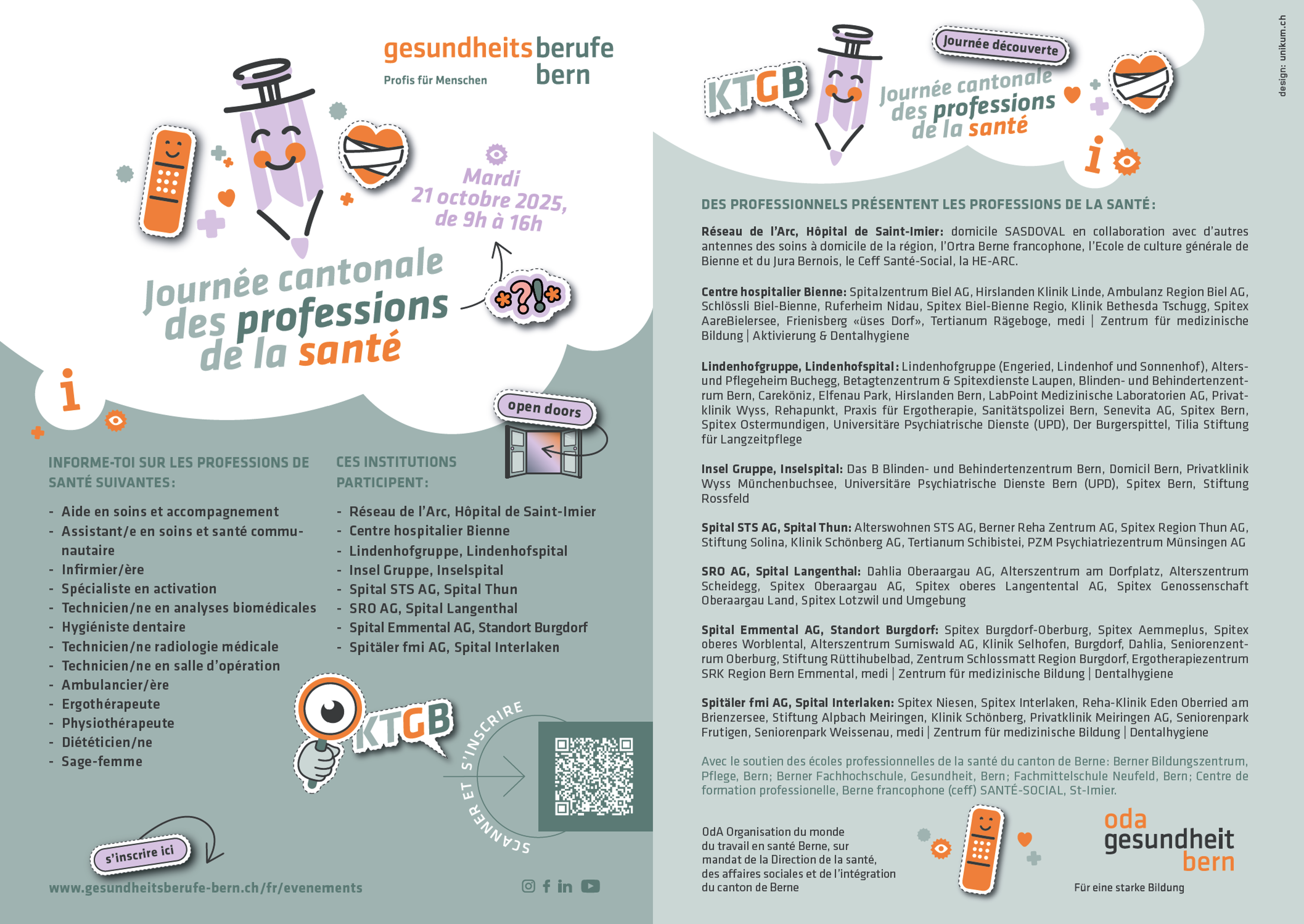A la journée cantonale des professions de la santé, les classes scolaires et les jeunes ou adultes intéressés peuvent découvrir les métiers de la santé en direct : des visites guidées, des aperçus passionnants du quotidien professionnel et des discussions avec des spécialistes permettent de découvrir ces métiers de manière concrète.